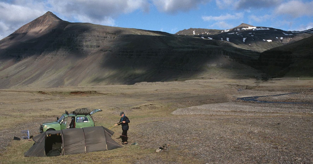 Ein kleiner See und ein schöner Wasserfall luden zur Rast ein. Schnell das Zelt aufgebaut und dann gemütlich im Schlafsack noch einmal die Geländekarten studieren. Am nächsten Morgen war keine Wetterbesserung in Sicht. Undurchdringlich der Nebel. Nur einige Goldregenpfeifer ließen ihre charakteristischen Rufe am See ertönen. Was tun? Weiterwarten und ein bisschen Angeln. Am späten Abend klart es dann auf. Dunkel wird es hier im Norden Islands im Juli sowieso nicht. Die Sterne funkeln plötzlich über uns. Am nächsten Morgen dann Raureif auf unserem Zelt, aber dafür auch blauer Himmel und Sonnenschein. Jetzt kann das Abenteuer endlich beginnen.