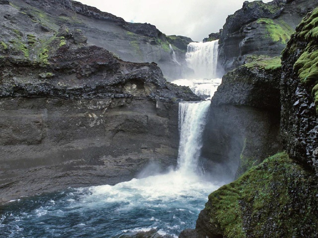 Die Schlucht heißt Eldgjá (Feuerspalte). Sie ist eine der gewaltigsten Vulkanspalten der Erde, bis zu 150 Metern tief. Dabei wild, unwirklich und pechschwarz. Besonders imposant ist die Feuerspalte an ihrem nordöstlichen Ende, wo sie sich fünf Kilometer lang als wahrhafter Schlund hinzieht, nur fleckenweise von giftgrünem Moos bewachsen. Dort wölbte sich auch vor einigen Jahren noch in halber Höhe an der Nordwestwand eine gleichmäßig gebogene Felsbrücke vor einem Wasserfall. Mittlerweile ist allerdings die malerische Felsbrücke eingestürzt. Die Kulisse ist trotzdem gewaltig: Zwei Wasserfälle rauschen die rund 150 Meter hohe Felswand hinab. Unten vereinen sich die Wasserkaskaden zu einem dunklen, fast tintigen Bach, der geräuschlos durch das Tal abfliest.