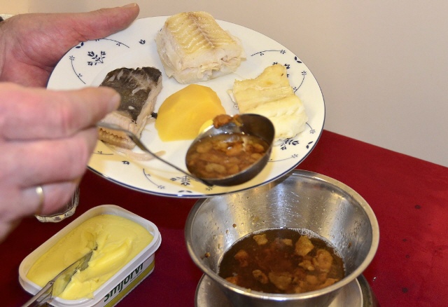 Beggi kostet einmal hier und pult dann dort ein bisschen Glibber vom Rochenflügel. Er hat von seiner gesunden Gesichtsfarbe nichts eingebüßt. „Schön scharf", schwärmt er. Aber noch lieber als Skata sei ihm der Salzfisch, gesteht er. So langsam hat sich die gute Stube mit erwartungsvollen Essern gefüllt. Riesenstücke der glibberigen Spezialität werden auf die Teller geladen und großzügig mit bruzzelndem Hammelfett übergossen. Als Verdauungshilfe fehlte jetzt nur noch ein Stück Eishai. Na dann, fröhliche Weihnachten!!!