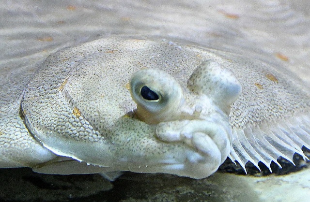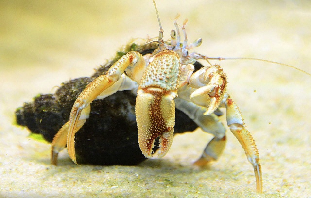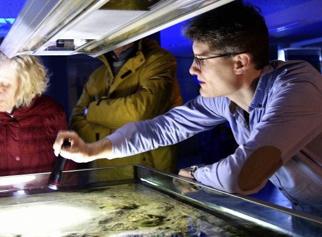 Im Wurster Nationalpark-Haus führte der Experte die Besucher zuerst an die kleinen Fensteraquarien im Eingangsbereich. Bleiche Schlangensterne hoben sich deutlich vom Aquarienboden ab. Und ein Butterfisch versteckte sich sofort, als der Strahl der Lampe ins Becken leuchtete. Dieser Fisch würde häufig mit der Buttermakrele verwechselt, so Mertzen. Sehr plastisch waren in der diffusen Dunkelheit die Seespinnen zu sehen. Diese Krebsart könne sich sogar aktiv tarnen, so Mertzen. Den Bewuchs aus Algen auf der Körperoberseite bringen sie selbst auf ihrem Panzer an und erneuern ihn nach jeder Häutung. Seesterne dagegen können hell und dunkel unterscheiden. Deswegen würde sie sich auch auf die Taschenlampe zubewegen. Ein spannendes Schauspiel boten die Miesmuscheln. Halb geöffnet konnte man ihnen von oben beim Fressen zuschauen. Wie ein Kamm funktionieren ihre langen Bartfäden und fächeln Kleinstlebewesen in den Muschelkörper hinein. Für Miesmuscheln sei ein sauberes Aquarium wie dieses eine echte Katastrophe, so Mertzen.
