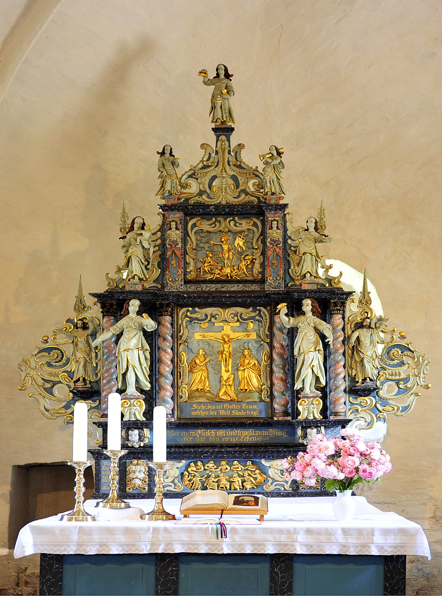 Die Kanzel wurde von Michael Ringkmacher geschaffen und zeigt nahe Verwandtschaft zu den Kanzeln in Dorum, Midlum und Padingbüttel. Der Kanzelkorb wird getragen von der Figur der heiligen Katharina, die eine Krone auf dem Kopf und ein rotes Gewand trägt. Blickfang für alle Kirchenbesucher ist eine Sanduhr aus dem Jahre 1754, die unübersehbar auf der Kanzelbrüstung steht. Der Altar im Ohrmuschelstil stammt auch aus der Werkstatt des Otterndorfers Jürgen Heidtmann und wurde 1671 gebaut. Eine Besonderheit der Wurster Kirchen ist der dritte Altarleuchter. Die dritte Kerze steht anstelle des Kreuzes und weist auf Christus als das Licht der Welt hin. 2400 Kilogramm wiegt die, vom Bremer Meister Ghert Klinghe gegossene Glocke „Gloriosa“ von 1459. Mit ihrem Durchmesser von 162 Zentimetern ist sie eine der größten, ältesten und klangschönsten Glocken im Landkreis. Am Schlagrand der Glocke sind zahlreiche Kerben ausgefeilt. Nach altem Aberglauben sollen die Feilspäne heilsame Kräfte besitzen. Der Erzgießer Heinricus schuf den Taufkessel aus Bronze im 14. Jahrhundert. Weitere Kostbarkeiten in der kleinen Bauernkirche sind ein Wandschrank aus Eichenholz aus dem 16. Jahrhundert, eine Kreuzigungsgruppe aus Eiche von 1500, das Tafelbild „Katharina mit dem Rad“, sowie die Schwedentafeln (gedruckte Thronbefehle des schwedischen Königs) von 1693 und 1697. ul