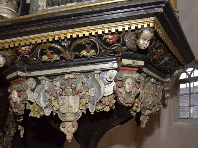 Das Gestühl stammt aus dem Jahr 1622. Die reichverzierte Kanzel wurde vom bekannten Schnitzer Michael Ringkmacher gearbeitet. Der Kanzelkorb ruht auf einer Steinfigur, die den Evangelisten Johannes mit Adler, Kelch und einem Wappen darstellt. Auf dem Schalldeckel steht Justitia mit Waage und Schwert auf einem mit Engelsköpfen besetzten Postament. Der Altar von 1696 hat ältere Kniebänke, deren Wangen die Jahreszahl 1617 enthalten und auf einen älteren, nicht mehr vorhandenen Altar hinweisen. Nach einem Schwelbrand im Jahre 1969 wurde das Inventar umfassend restauriert, sodass es wieder die ursprüngliche Farbgebung hat. Die historische Sonnenuhr aus Sandstein von 1750 konnte nach gründlicher Restauration 2002 an der Südseite der Kirche wieder aufgehängt werden. ul